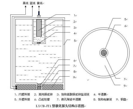 圖一為 LYCB-JT1 的結(jié)構(gòu)示意,由圖可見(jiàn) LYCB-JT1 是由兩只同心的塑料套筒和附著在塑料筒底部的有同心孔的鋼盤所組成。其中內(nèi)塑料筒 1 內(nèi)置由高純銅或鋅制成的電極 2 和飽和硫酸銅溶液或鋅鹽溶液 3 并且在內(nèi)筒 1 的底部開(kāi)孔并通過(guò)半透膜 4 和外塑料筒 5 相連通。外筒 5 內(nèi)充滿惰性飽和電解質(zhì)溶液并在筒的底部設(shè)有一突出的與鋼盤 9 同心的塑料短管 6。短管 6 內(nèi)鑲有半透膜和微孔陶瓷。這樣外筒 5 就成為內(nèi)筒 1 所構(gòu)成參比電極的緩沖鹽橋并將鹽橋的開(kāi)孔通過(guò)絕緣的塑料短管 6 和半透膜微孔陶瓷 7 置于鋼盤 9 的中央空心內(nèi),即鋼盤 9 是環(huán)繞在鹽橋孔的四周。